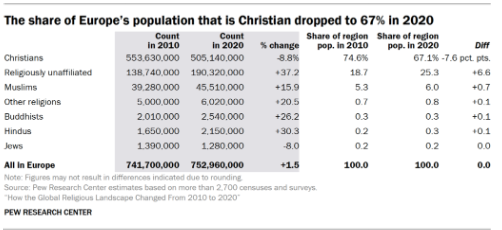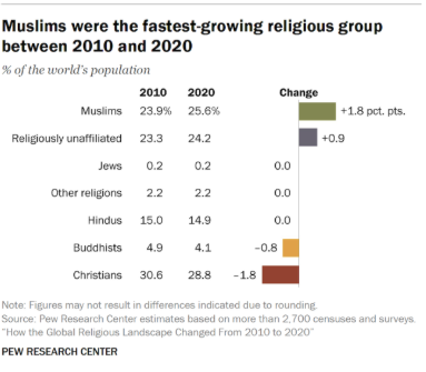 Alla luce dei dati del Pew Research Center relativi al periodo 2010-2020 e in riferimento alle evidenze empiriche emerse dal “FRA EU-MIDIS III” del 2022 (rapportato, a sua volta, al “FRA EU-MIDIS II” del 2016), si osserva come nel 2020 i musulmani abbiano costituito il 6 % della popolazione europea complessiva. Contestualmente, il 47 % dei musulmani intervistati nel sondaggio del FRA del 2022 ha dichiarato di aver subito discriminazioni fondate su etnia e religione, nei cinque anni antecedenti al sondaggio. Tale dato evidenzia un’Europa, in cui un musulmano su due dichiara di subire discriminazioni, seppur le proiezioni demografiche indichino una crescita stabile di musulmani nel futuro prossimo.