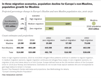 Eppure, secondo le proiezioni del Pew Research Center su 30 paesi europei (Report “Europe’s Growing Muslim Population”, novembre 2017), la popolazione musulmana del milieu europeo è destinata ad aumentare nei prossimi decenni, indipendentemente dalla presenza o meno dei cosiddetti flussi migratori. Anche nel caso estremo in cui si possa ipotizzare che tutte le migrazioni verso l’Europa si fermino immediatamente e in via permanente, la quota di musulmani sulla popolazione salirebbe sino al 7.4 %, entro il 2050. Altri due scenari alternativi, uno comprendente una migrazione regolare, la quale prosegue in assenza di nuovi flussi migratori di rifugiati e l’altro di migrazioni regolari in aggiunta ad elevati flussi di rifugiati – simili a quelli osservati negli anni 2014-2016 – porterebbero ad una quota musulmana, rispettivamente, dell’11.2 % e del 14 % della popolazione totale europea, entro il 2050.